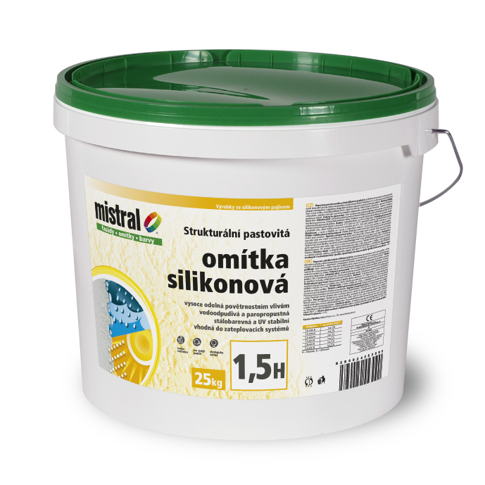 Pastovitá silikonová omítka, propustná pro vodní páry, dlouholetá životnost, s obsahem aktivních látek proti plísním a řasám zatíraná, zrno 1,0mm , 1,5mm , 2,0mm , 3,0mm rýhovaná struktura, zrno 1,5mm , 2,0mm